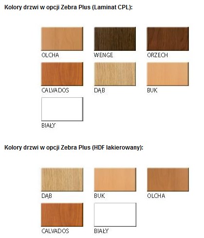 Wykończenie: obustronnie oklejona płytą lakierowaną HDF (ZEBRA) lub płytą laminowaną CPL o zwiększonej odporności na ścieranie(ZEBRA Plus)