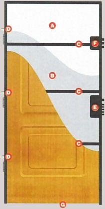 Konstrukcję wewnętrzną drzwi stanowi ożebrowanie, które pokryte zostało stalową ocynkowaną blachą. Skrzydło i ościeżnicę laminowano okleiną o fakturze drewnopodobnej w naturalnych kolorach. Środek drzwi wypełniono samogasnącym styropianem.