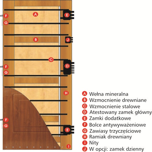 Drzwi wyposażone są w zamek wpuszczany wielopunktowy, trzy zawiasy Z5, trzy bolce antywyważeniowe, ościeżnice w kolorze skrzydła (laminowaną lub lakierowaną), uszczelkę pęczniejącą oraz okucia jak w drzwiach Batory.